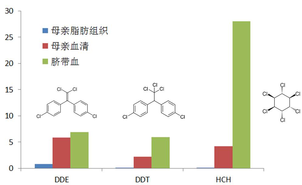 他们检测了DDE、DDT、HCH三种有机氯农药,发现脐带血中这些农药的浓度远高于母亲血液,而母亲脂肪组织中的含量是最低的。