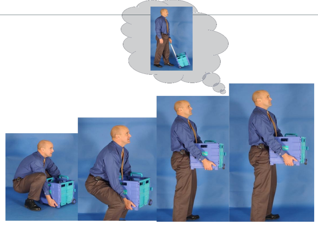 大家可以试一试,由于要保证背部直立,所以想要提起地面的东西,首先得要蹲下来;或者是一只腿跪下来,另一只腿蹲着。在起身的时候,利用髋部腿的力量,慢慢的站起。同时,在搬重物的时候,将重物尽可能的靠近身体,保证背部挺直。这种情况下,不会产生过大的力矩,作用在腰部肌肉的力量,会比较温和,避免腰部产生损伤。当然有条件的话,还是使用小推车比较好。