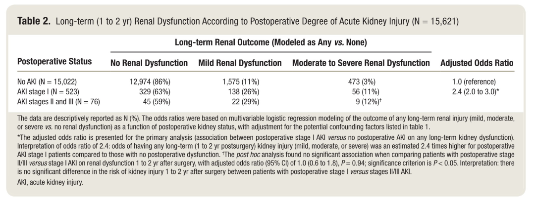 在术后有II期或III期AKI的患者中,只有12%的患者在1到2年后仍被分类为II期或III期AKI。然而,29%的人仍然有轻微的伤害。有趣的是,II期和III期AKI的远期预后与I期AKI相当。因此,I期AKI与更严重的术后肾损伤几乎一样可以预测远期肾功能不全。