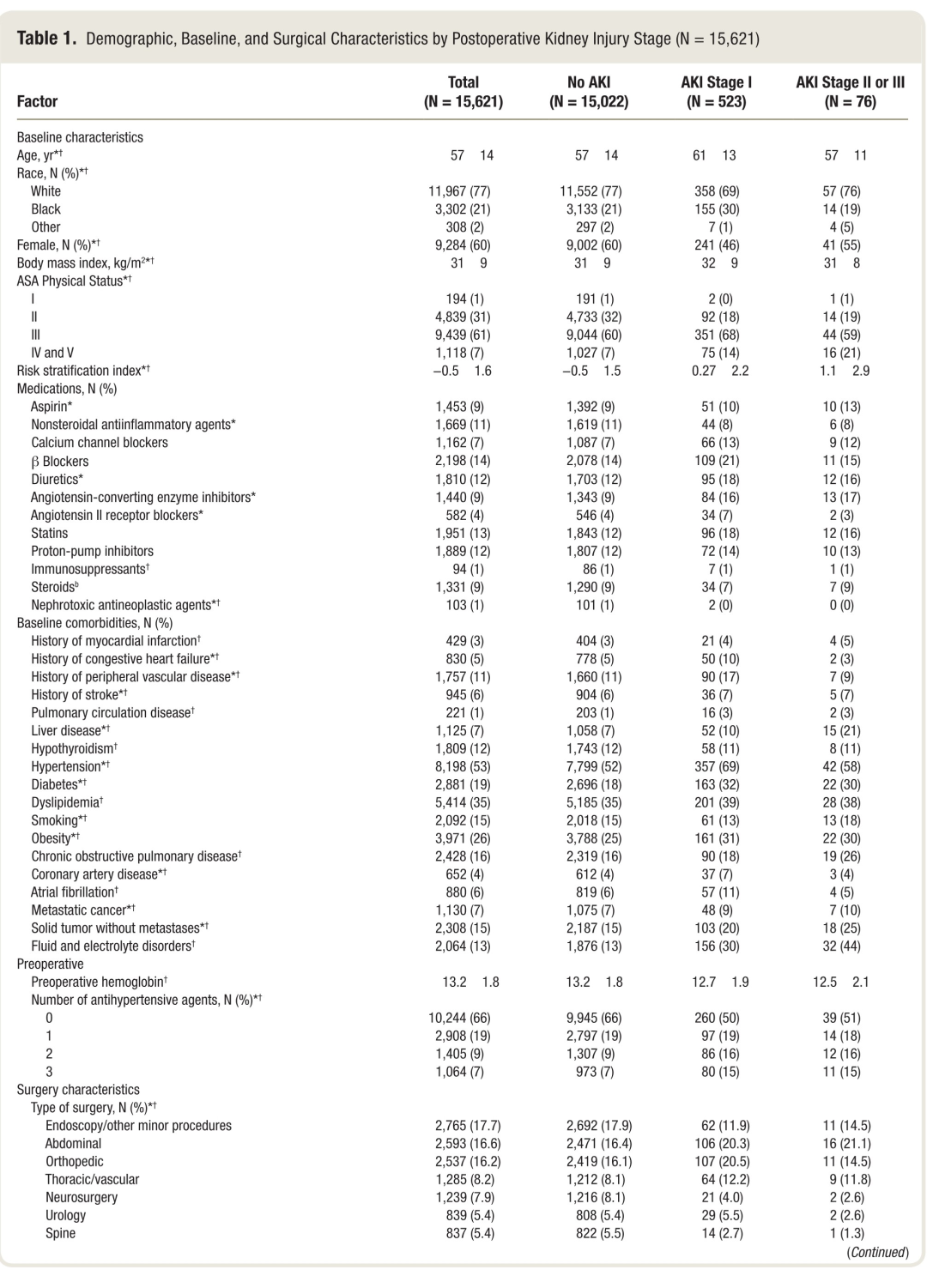 术后Ⅰ期AKI发生率为523例(3%)。仅有76例(0.5%)术后AKI为II期或III期。不同组别的人口统计学、基线和手术特征详细见表1。