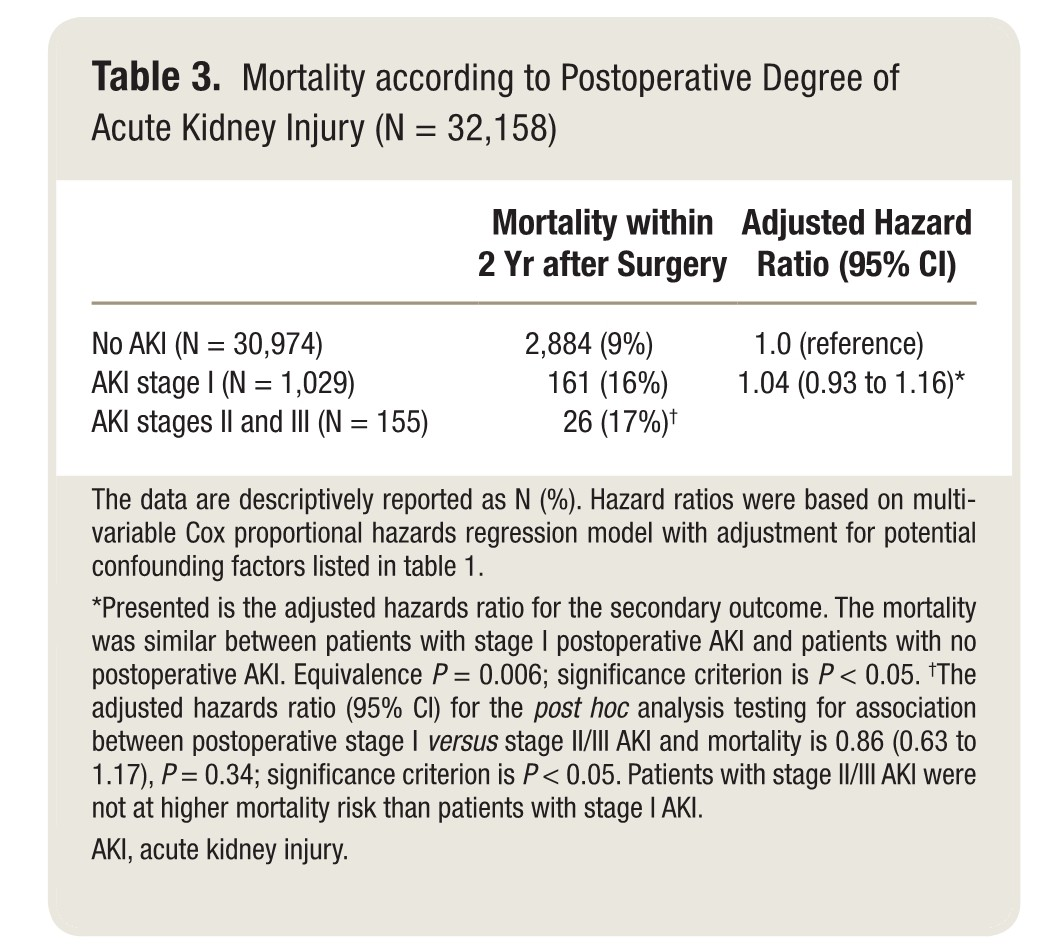 我们对死亡率的二次分析显示,术后I期AKI患者与无AKI患者相似,风险比(95%CI)为1.04(0.93至1.16)。因为95%的可信区间在预先定义的等值范围内,所以统计结论是两组之间的死亡率是相似的。AKI术后I期与II/III期的病死率差异无统计学意义(P>0.05)。术后AKI对死亡率的影响很小或没有,这也许并不令人惊讶,因为至少在一段时间内,肾功能衰竭是可以安全治疗的。然而,这些结果是基于相对较少的死亡人数,因此应谨慎考虑。