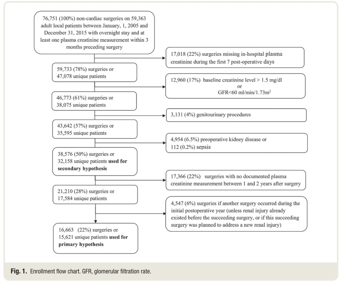 我们排除了术前慢性肾脏疾病(附录1)、脓毒症和泌尿生殖系统手术(附录2)的患者。我们还排除了在最初的术后1年内再次手术的手术,除非在随后的手术之前已经存在肾损伤,或者随后的手术是为了解决新的肾损伤(例如,动静脉瘘以促进血液透析)。