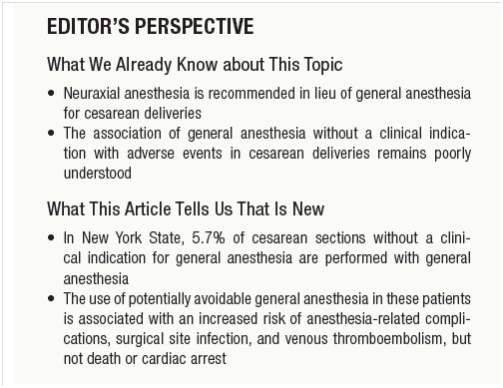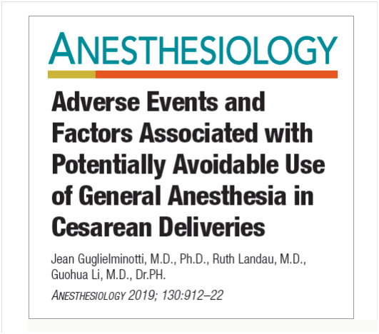 2.Jean Guglielminotti,Ruth Landau,Guohua Li.Adverse Events and Factors Associated with Potentially Avoidable Use of General Anesthesia in Cesarean Deliveries.Anesthesiology,2019,130:912–922.