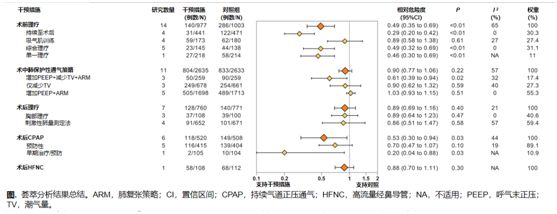 ARDS=急性呼吸窘迫综合征;ARM=肺复张策略;ASA=美国麻醉医师协会;CI=置信区间;CPAP=持续气道正压通气;EMBASE=医学文摘数据库;FIO2=吸入氧浓度;HFNC=高流量经鼻导管;MEDLINE=联机医学文献分析和检索系统;NA=不适用;PEEP=呼气末正压;PPCs=术后肺部并发症;RCT=随机对照研究;RR=相对危险度;TV=潮气量;ZEEP=呼气末零压通气