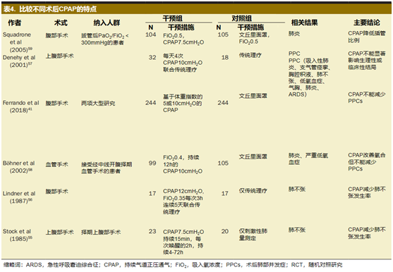 主要结论有:(1)CPAP预给氧改善了氧合,并且较高FiO2的使用增加肺不张发生率的同时也增加氧饱和度降低的次数;(2)术前启动理疗方案与PPCs发生率降低相关;;(3)不同研究中术中保护性机械通气对PPCs的影响不一,并且TV降低和PEEP增加的重要性仍不清楚;(4)仅在术后启动理疗与PPCs发生率的降低无关;(5)术后预防性CPAP和HFNC提供的益处有限。