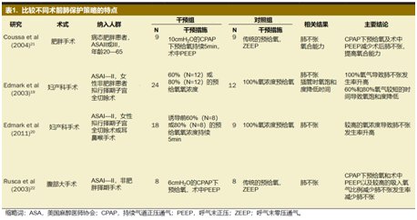 我们发现4项RCTs诱导时使用不同浓度的氧气进行正压通气预充氧(表1)。我们没有将这些结果存在异质性以及缺乏主要术后结局的研究纳入到正式的荟萃分析中。有两项研究表明,与传统的预充氧和术中无PEEP相比,CPAP预充氧联合术中PEEP可减少肺不张发生率。有两项研究报告了预充氧与较高吸入氧浓度(FiO2)增大了肺不张程度,但允许在插管期间氧饱和度降低之前较长时间的给氧。