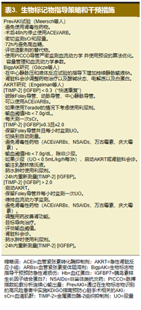 Engelman等人还研究了生物标志物引导下应用“KDIGO AKI集束化治疗”在心脏手术患者中的作用。他们方法的不同之处在于如果在术后第一天早晨测量的[TIMP-2]·[IGFBP7]≥0.3,则启动急性肾脏反应小组(AKRT)。随后,AKRT基于KDIGO指南补充治疗框架(表3)。在干预期间采用这种方法,能够在7天内将中重度AKI的发生率减少89%(P=0.01)。因此,生物标志物在围术期AKI治疗和管理中的引导作用在不断发展。