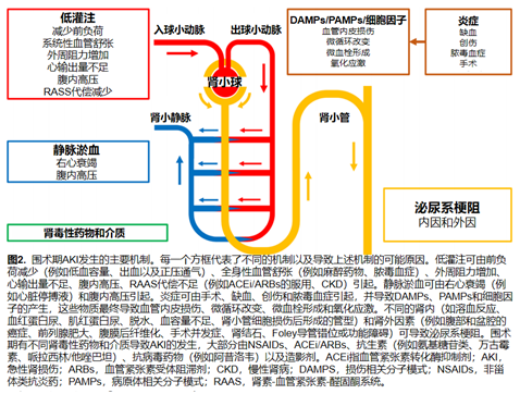 围术期AKI的发生往往是多因素的,多种病理生理机制同时发挥作用。最常见的机制包括肾脏灌流不足、静脉淤血、IAH、炎症、泌尿系梗阻和/或使用肾毒性药物(图2)。
