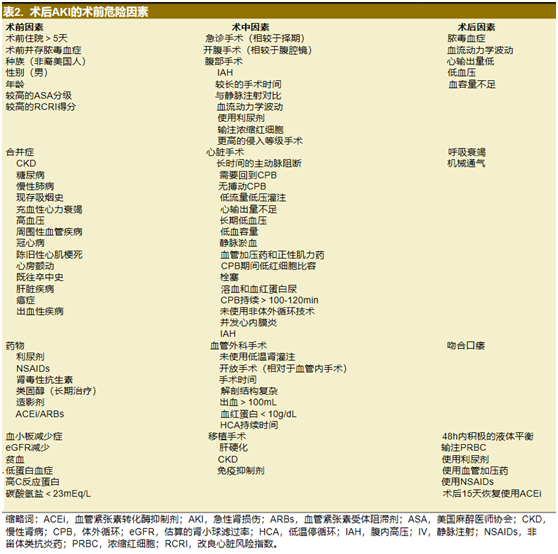 术后是AKI发生与否的关键时期。术后低血压和脓毒血症是AKI发生的主要危险因素。术后肾毒性药物的使用,例如NSAIDs或某些抗生素(万古霉素、哌拉西林/他唑巴坦等)也会增加术后AKI的总体发生风险。表2详细列举了其他的术后危险因素。