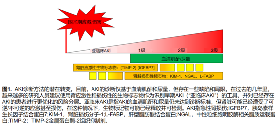 除却损伤性生物标志物外,肾应激性标志物近些年来引起了人们极大的兴趣,尤其是有助于AKI的危险分层(表1)。这些标志物是金属蛋白酶-2组织抑制剂(TIMP-2)和胰岛素样生长因子结合蛋白7(IGFBP7)。当肾上皮细胞受刺激时,上述物质随尿液排泄,并且是细胞周期停滞的介质。总之,尿液中含量([TIMP-2]·[IGFBP7])的曲线下面积为0.8可以预测12h内中重度的AKI。由于其可以监测心脏手术患者术中发生中重度AKI的风险,因而对这些患者的危险分层非常有帮助。
