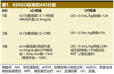 急性肾损伤(AKI)被认为是由于肾脏受损引起的以肾功能急剧下降为特征的一种临床综合征。AKI的临床诊断是建立在“改善全球肾脏疾病预后”(KDIGO)标准之上利用血清肌酐的增加和尿量的减少来判定的(表1)。肾功能即肾小球滤过率(GFR),与血清肌酐成反比。这种现象在较低的肌酐值时更为明显。对于一名基线肌酐值为0.8mg/dL的患者,0.3mg/dL的变化反映了GFR37.5%的变化。因此,血清肌酐微小的变化代表着肾功能发生了较大的变化,故而具有临床意义。这在经历胸心外科手术以及手术或非手术住院患者中得到了证实。