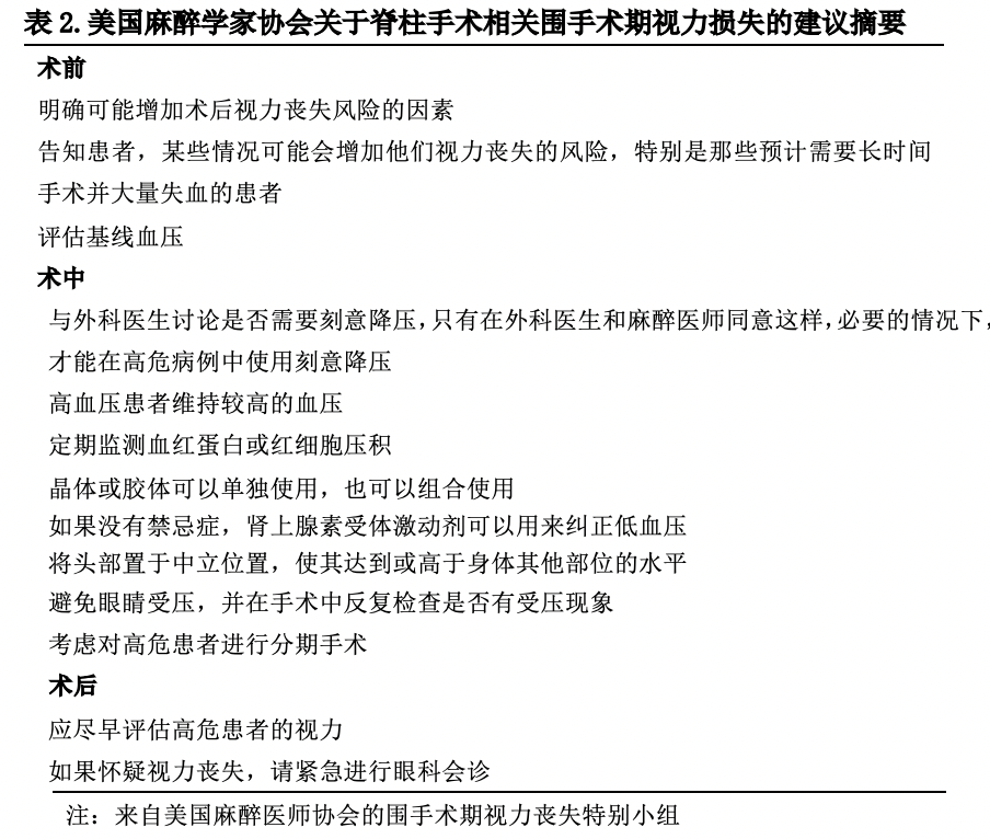 脊柱手术后最常见的是术后视力丧失,但也有其他类型的非眼科手术。2012年,美国麻醉医师协会(ASA)针对脊柱手术后的围手术期视力丧失提出了一项实践建议。在2019年,ASA更新了这一实践建议,并获得了北美神经眼科学会和神经外科麻醉与重症治疗学会(SNACC)的认可。表2汇总了更新后的实践建议。