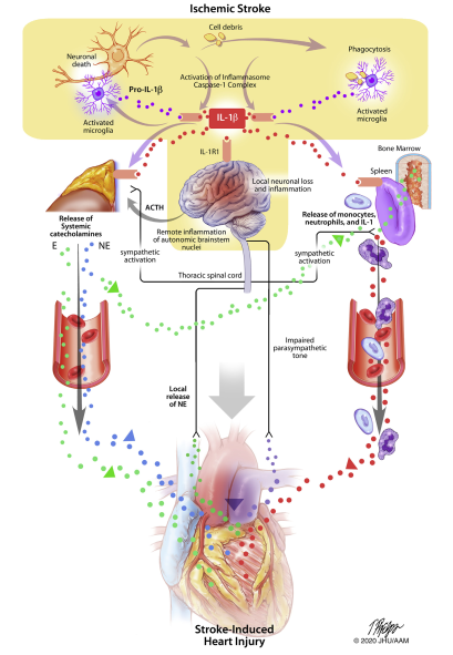 卒中后,岛叶皮质和其他负责心脏自主调节的大脑结构的参与会导致自主神经功能障碍。卒中背景下的神经元死亡导致局部脑部炎症,其特征是小胶质细胞的激活以及细胞因子和趋化因子的产生(如下图)。