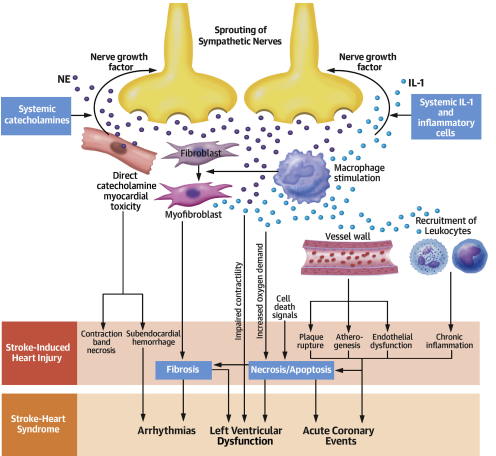图:卒中至心脏损伤的局部机制:去甲肾上腺素通过体循环和交感神经末梢到达心脏,损伤心肌细胞(收缩带坏死)和心内膜下组织(局部出血),刺激巨噬细胞,并激活成纤维细胞变成肌成纤维细胞。白细胞介素(IL)-1和炎症细胞通过体循环进入心脏,进一步刺激肌成纤维细胞和巨噬细胞的激活。炎症导致动脉粥样硬化、斑块破裂和内皮功能障碍。心肌细胞、肌成纤维细胞和交感神经释放神经生长因子,触发交感神经萌发,进一步放大长期的肾上腺素能反应。心肌β-肾上腺素能受体解偶联损害收缩能力去甲肾上腺素大量释放增加需氧量。在氧需量增加和冠状动脉微血管壁改变的背景下,神经元死亡导致的“细胞死亡信号”增加了坏死/凋亡。心肌细胞坏死和肌成纤维细胞活化导致纤维化增强。
