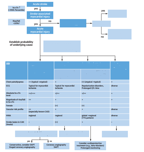 尽管cTn水平在识别和量化心肌损伤方面有很高的特异性,但潜在的病因包括各种不同的缺血性和非缺血性病因。第一个关键步骤是通过连续测定cTn来鉴别急性和慢性心肌损伤。急性心肌损伤表现为cTn水平的升高和/或下降,而临床稳定的结构性心脏病所致的慢性心肌损伤则不存在这种动态模式。大约85%的卒中患者cTn持续升高,代表慢性心肌损伤。急性心肌损伤与慢性心肌损伤相比具有更高的短期死亡率。因此,应及时确定卒中后急性心肌损伤的潜在原因,以改善预后(如下图)。