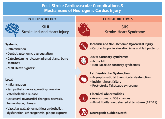 2016年,全球有550万人死于卒中,鉴于五分之一的卒中患者死于心血管疾病,据估计,在脑血管事件的幸存者中,每年有100多万人死于卒中后的心血管疾病,尽管如此,心血管死亡只是冰山一角,因为卒中与增加非致命性心血管并发症的风险有关。卒中后心脏事件在临床上被归类为“卒中-心脏综合征”(SHS),由几种称为“卒中所致心脏损伤”(SIHI)的病理生理机制引起:
