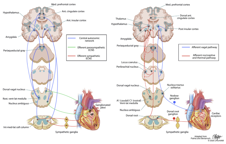 中枢自主神经网络与外源性心脏神经系统(A)传出系统(B)传入系统,红线代表一条平行的内脏感觉通路,来自延髓外侧部A1/C1组儿茶酚胺能神经元,这些神经元向下丘脑、导水管周围灰质和篮斑发出投射。