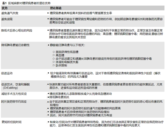 区域麻醉的支持者指出区域麻醉相较于全身麻醉具有许多潜在优势。包括维持自主通气而不丧失气道通畅性;降低通气失败的风险;优化术后即刻疼痛管理;早期恢复正常饮食;减少术后恶心呕吐的风险;在某些情况下减少转化为术后慢性疼痛的风险;减轻手术压力性反应;较高的患者满意度;以及降低静脉血栓栓塞的风险。对于糖尿病患者,这些益处可能更为显着(表1)。但是,应注意的是,区域麻醉对患者长期预后临床重要性的证据并不一致,除非正确用药和管理以提供出色的术后镇痛管理,并且仅限于某些结果。
