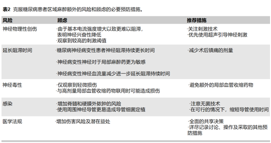 这篇综述说明了糖尿病患者区域麻醉增加的风险和收益。但是要实现收益,就必须降低额外的风险(表2)。