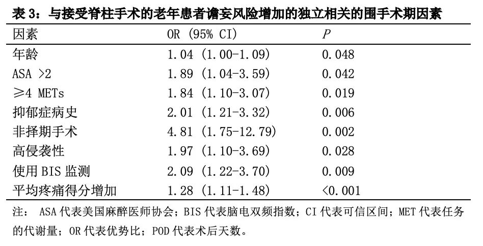 谵妄是一种急性的、波动的注意力和认知障碍。谵妄可发生在麻醉后和危重病人中,年龄较大的患者风险最高。Susano等人回顾了716名65岁或以上接受脊柱手术的患者的记录,以找出与住院期间神志不清风险增加相关的因素。总体而言,127名患者(18%)被诊断为谵妄。如表3所示,7个因素被发现独立地与增加谵妄的风险相关。谵妄与其他住院并发症(OR=3.52,95%CI=2.0 8~5.91,P<0.001)和离家出院几率(OR=4.51,95%CI=2.35~8.92,P<0.001)独立相关。谵妄患者的住院时间增加了60%,30天后的再住院率(14.7%比6.0%,P=0.001)和死亡率(5.5%vs0.8%,P=0.002)都有所增加。