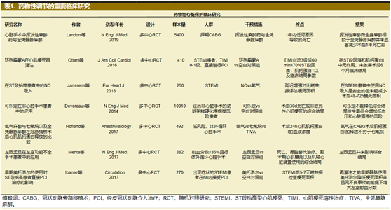 部分药物已经在心肌IRI临床研究中进行了评估(表2)。挥发性麻醉药(例如七氟烷、异氟烷和地氟烷)已被证明可以通过激活和启动IPC和RIPC同样的细胞通路来提供心脏保护作用。精心设计的动物研究已多次证明,心肌在缺血前暴露于挥发性麻醉药可以在随后的IRI中提供显著的益处。