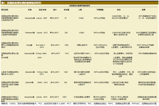 Zarbock等研究了240例CABG患者中RIPC对急性肾损伤(AKI)的影响:RIPC显著降低了AKI发生率及肾脏替代治疗的需要。虽然这项研究没有评估心脏保护作用,但它表明RIPC在心脏手术中可能对特定患者人群有益。