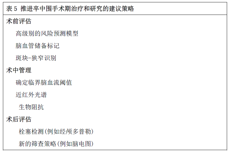 术中危险因素也值得进一步研究。例如,新出现的数据表明,术中血压通常低于较低的自动调节阈值,低通气和过度通气都可能进一步降低脑血流量,使其低于缺氧缺血性损伤所需的阈值。神经生理学方法(如脑电图、经颅多普勒、生物阻抗)可用于检测术后脑血管易损性。最后,可以创建围手术期卒中登记表,以整理术前危险因素、手术亚型、术中生理和事件、术后处理、报告的病因和长期轨迹等细节。详细的临床信息,特别是涉及卒中前的临床和生理事件,以及神经放射成像(如果有),可以为病理生理学的理解提供信息。表5概述了这些候选战略。