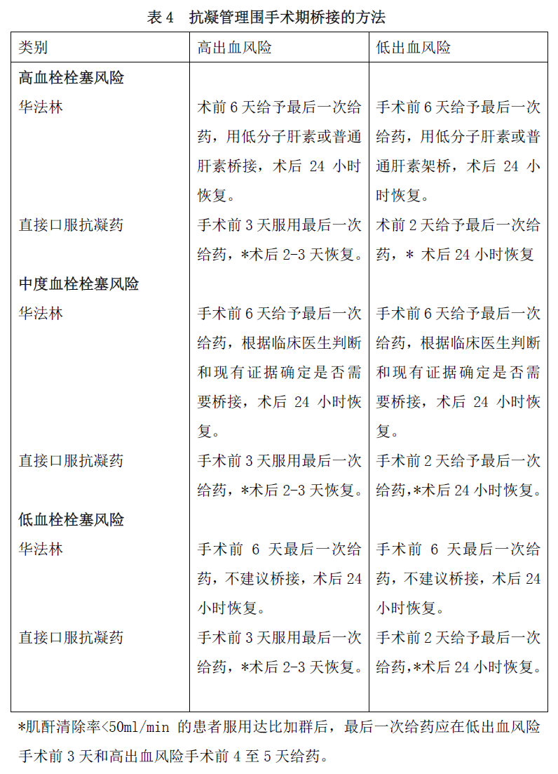 抗凝策略必须平衡预防血栓栓塞的需要和手术大出血的风险。表4描述了美国外科医师学会目前提出的抗凝策略。对于维生素K拮抗剂,如华法林,基于肝素的桥接疗法通常保留给高危患者,如机械心脏瓣膜、风湿性心脏病、高CHA2DS2-VASc(充血性心力衰竭/左心室功能不全、高血压、年龄≥75、糖尿病、卒中/短暂性脑缺血发作/血栓栓塞、血管疾病、年龄65-74岁、女性)得分(6分或更高)、近期血栓栓塞、抗凝治疗期间血栓栓塞。对于低到中等风险的患者,桥接疗法增加了出血的风险,但不会降低血栓栓塞的发生率。对于直接口服抗凝剂,根据血栓栓塞风险、手术出血风险和合并症(例如肾功能),最后一次给药通常在手术前2-3天使用。这些抗凝剂不需要桥接,因为这样的治疗往往会增加大出血的风险,而不会减少血栓栓塞事件。围手术期抗凝剂用于手术的评估研究(PAUSE)前瞻性地评估了直接口服抗凝剂(阿哌沙班、达比加群、利伐沙班)围手术期管理的标准化方案的安全性。在整个研究队列中,卒中和围手术期大出血的风险都很低。对于肌酐清除率超过50ml/min的患者,每种抗凝剂的最后一次给药在手术前2-3天给予,整个研究过程中方案依从性很高。这项研究反映了表4中概述的直接口服抗凝剂的策略,并证明了在实际环境中实施此类方案的可行性。总体而言,抗凝桥接仅保留给服用维生素K拮抗剂(如华法林)的高危患者。对于直接口服抗凝剂,这些药物在手术前2-3天维持,术后1-3天恢复,具体取决于血栓栓塞和出血风险(表4)。