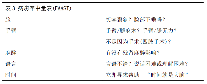 有许多资源可以帮助检测和管理卒中。已经为非专科医生开发了几种筛查工具,尽管这些量表都没有在围手术期环境中得到验证。理想的围手术期筛查工具应该简单易用、管理敏捷,并且能够检测残留麻醉和相关混杂因素(如阿片类药物的使用、疼痛)的神经功能缺陷。一种建议的策略,面部,手臂,麻醉,言语,时间(FAAST)卒中量表(表3),旨在通过关注重大卒中的体征和症状来满足这些标准。例如,大脑血管闭塞可以通过手臂或腿部瘫痪、失语症和/或面部下垂来识别。在重大卒中期间,这些体征可能单独出现,也可能集体出现。该量表提示临床医生以一种简单、有效的方式评估这些体征。这样的量表可以在术后早期使用,并由非专科临床医生进行管理。
