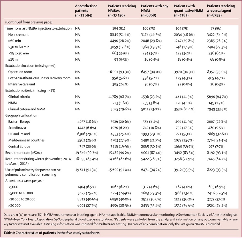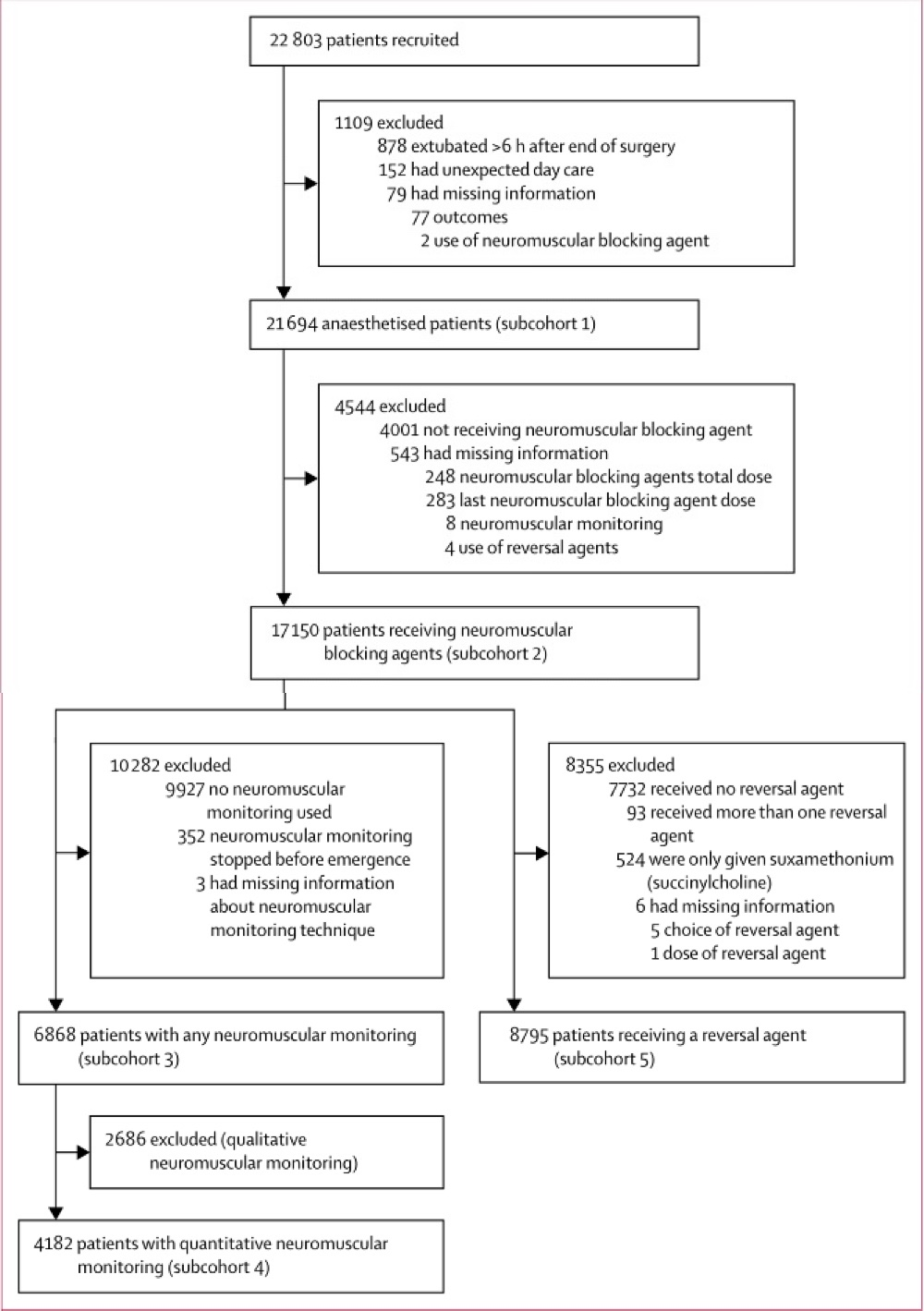 因为这七个关键因素并不适用于所有患者,我们构建了5个亚队列:接受全麻的患者、接受神经肌肉阻滞剂的患者、接受神经肌肉监测的患者、定量神经肌肉监测的患者和接受逆转剂的患者。