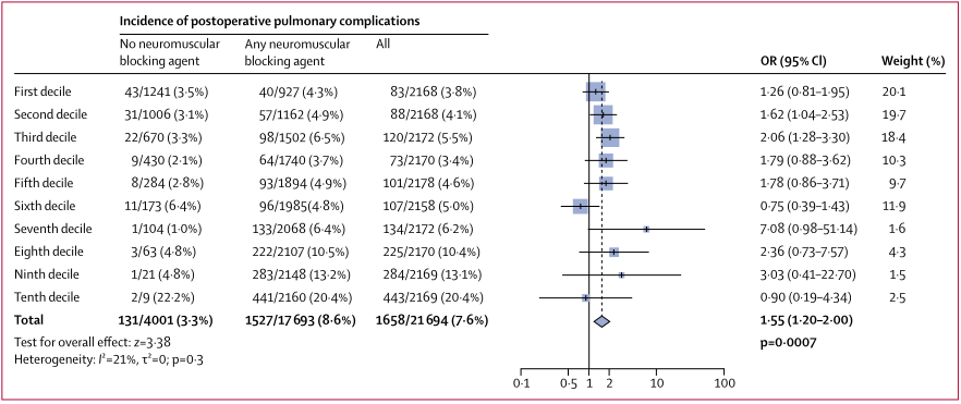图2:神经肌肉阻滞剂对基于倾向评分的10个同等大小的患者亚组的麻醉后肺部并发症的影响