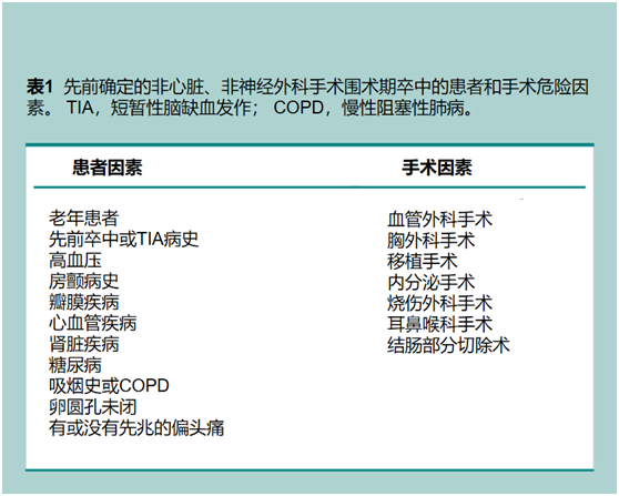 应筛查围术期卒中的危险因素。