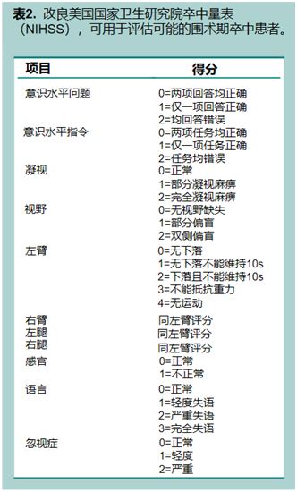 麻醉医师在围术期卒中的识别中起着重要作用,而筛查工具可能适用于围术期高风险的患者。术后已考虑了几种卒中筛查工具。改良美国国家卫生研究院卒中量表(mNIHSS)(表2)被认为是一种实用且可靠的卒中筛查工具,尽管迄今为止尚无经过验证可用于检测手术患者卒中。