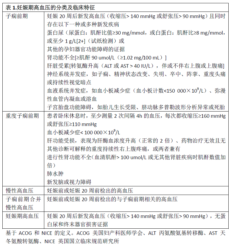 美国妇产科医师学会(ACOG)将在怀孕时的高血压疾病分为四类(表1):