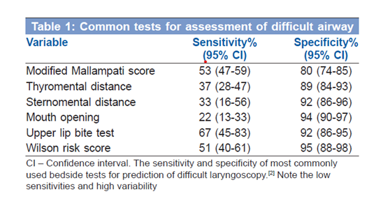 (CI–置信区间。最常用床旁检查对困难喉镜检查的预测的敏感性和特异性。注意低灵敏度和高可变性。)