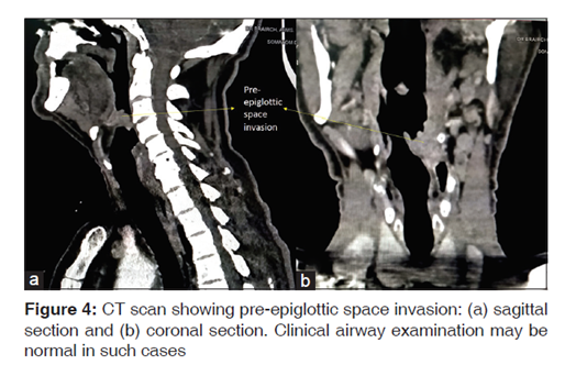 临床上无法评估的会厌前会厌和声门旁间隙侵犯达DA的程度也可以使用CT扫描来判断。[图4]