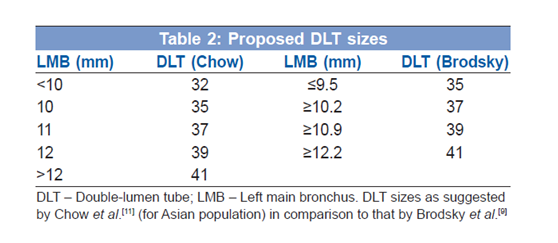 (DLT –双腔管;LMB –左主支气管。针对DLT型号大小(针对亚洲人口)Chow等人与Brodsky的建议比较。)