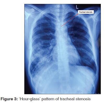 5.诊断气管狭窄-气管阴影的“沙漏”形状[图3]。