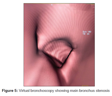 (虚拟支气管镜检查显示主要支气管狭窄。)