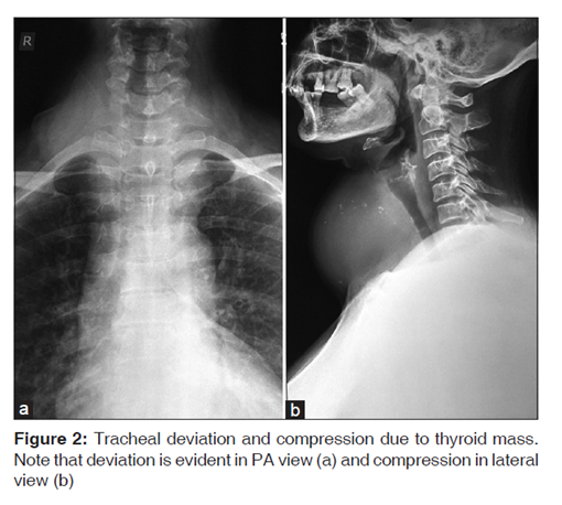 (甲状腺肿块引起的气管偏移和压迫。注意在PA视图(a)中有明显的偏差,而在侧视图中则有压缩。)