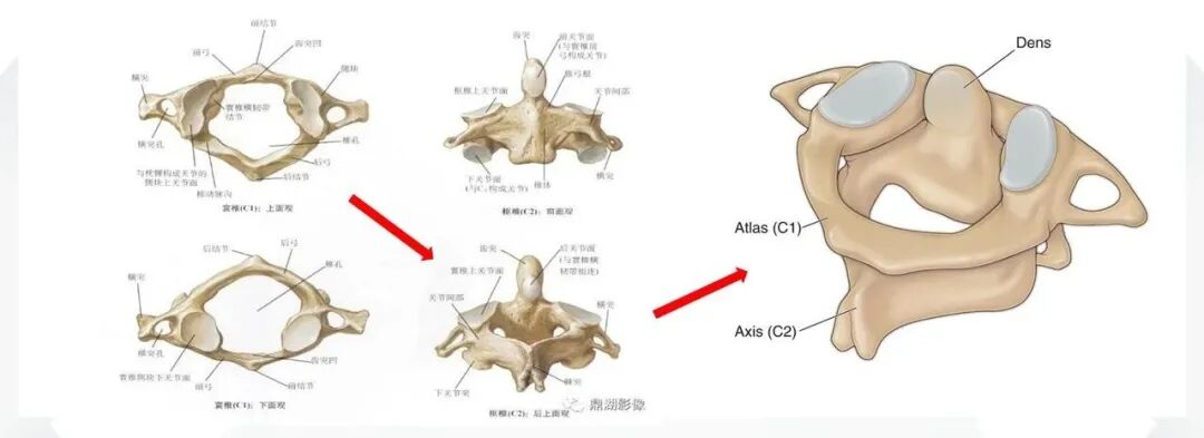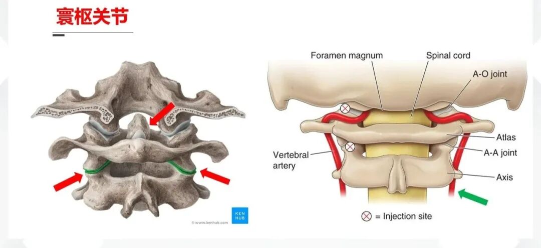寰枢关节的三个小关节(下图红色箭头),形成稳定的关节活动;两侧有同侧的椎动脉(绿色箭头)上行,穿横突孔入颅内。