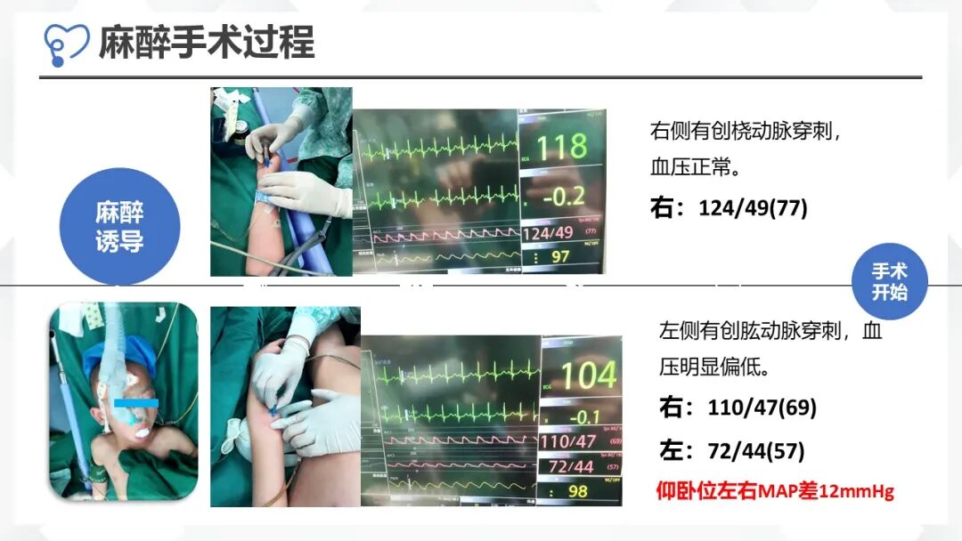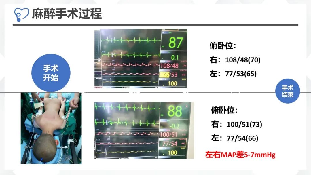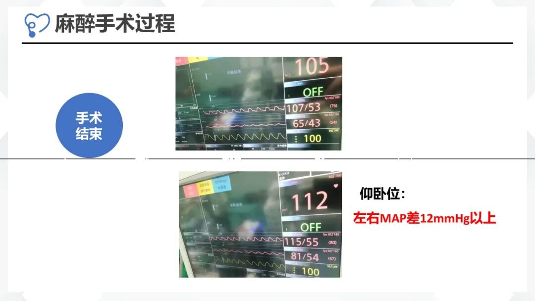 术中我们留置了左右两路有创动脉监测,手术很顺利;但术中发现两侧血压差值与患者体位相关:仰卧位左右侧MAP差值达10-15mmHg,且正常侧(右侧)舒张压高于盗血侧(左侧),而俯卧位后MAP差值降低至5-8mmHg,且正常侧舒张压低于盗血侧。以上现象在术中一直存在,且在患者手术结束改仰卧位后,差值恢复术前(如下图)。