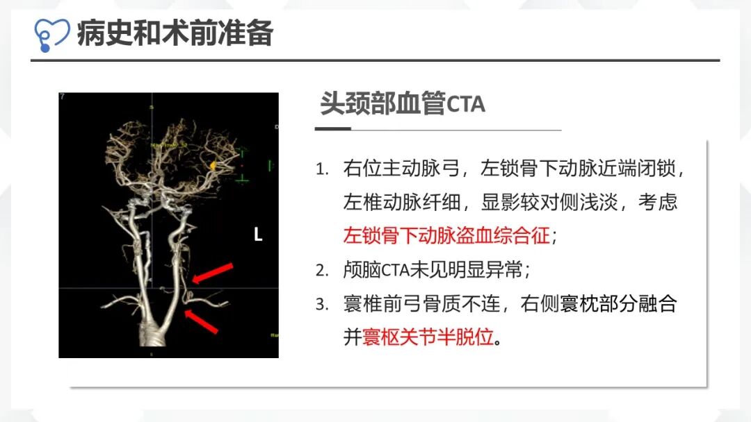 如下图,此患者颅脑CTA提示右侧锁骨下动脉正常,左侧起始段缺失,左臂依靠左椎动脉逆流供应。而手术部位刚好在寰枢椎,可能损伤左侧椎动脉,继而波及左臂,此时监测两侧的血压显得非常有必要,可早期发现左臂缺血。