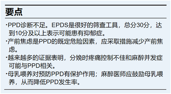 尽管围产期疼痛与PPD之间可能存在联系,但目前的证据并不支持使用椎管内分娩镇痛与PPD的发展之间存在明确的因果关系或预防关系。但是,麻醉医师在预防PPD方面仍然可以发挥重要作用。椎管内镇痛或麻醉的并发症以及剖宫产全身麻醉的使用都与PPD相关。因此,预防和处理并发症以及减少术中全身麻醉的使用可能在降低PPD的后续风险方面发挥重要作用。母乳喂养似乎对PPD的发展也有保护作用,因此应避免使用与即刻哺乳不相容的药物。不应指示患者因麻醉而延迟母乳喂养,除非其早期恢复至可以安全的怀抱及照顾婴儿。随机对照试验可以进一步的探索和提供更为明确的结果来显示椎管内分娩镇痛和PPD之间是否存在保护关系。
