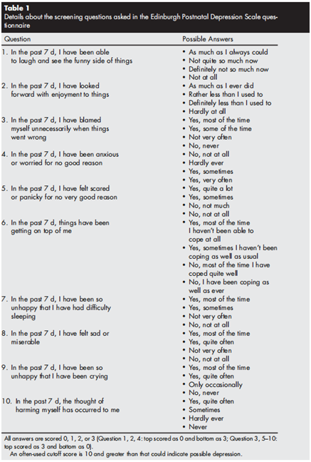 美国精神病学协会的《精神疾病诊断和统计手册》第五版包含“围产期发作”的说明符以表明抑郁症可以发生在孕期或娩出后4周内。PPD是一个通常用于表示产后期间开始出现的抑郁症状的术语。PPD在临床中常常未被诊断出来,因为医生可能无法将预期的产后转变(即疲劳、睡眠困难)与抑郁症区分开来。在某种程度上,这也是美国妇产科医师学会推荐使用标准化问卷(例如EPDS)作为筛查工具以提高产后女性抑郁症的准确识别率的原因之一。表1列出了该问卷的具体问题细节。该问卷与1987年推出,已被翻译成40种语言,并因其简洁方便而被广泛使用。一旦确定,可以进一步评估女性以确定她们是否患有临床抑郁症。因此,EPDS最恰当的理解应是筛查问卷而不是诊断工具。然而,由于易于使用和简单,大多数研究仅使用EPDS来识别抑郁女性。已发现大于10分的临界值对轻度和重度抑郁症的敏感性为0.83(95% CI,0.81-0.86),特异性为0.85(95% CI,0.84-0.86)。