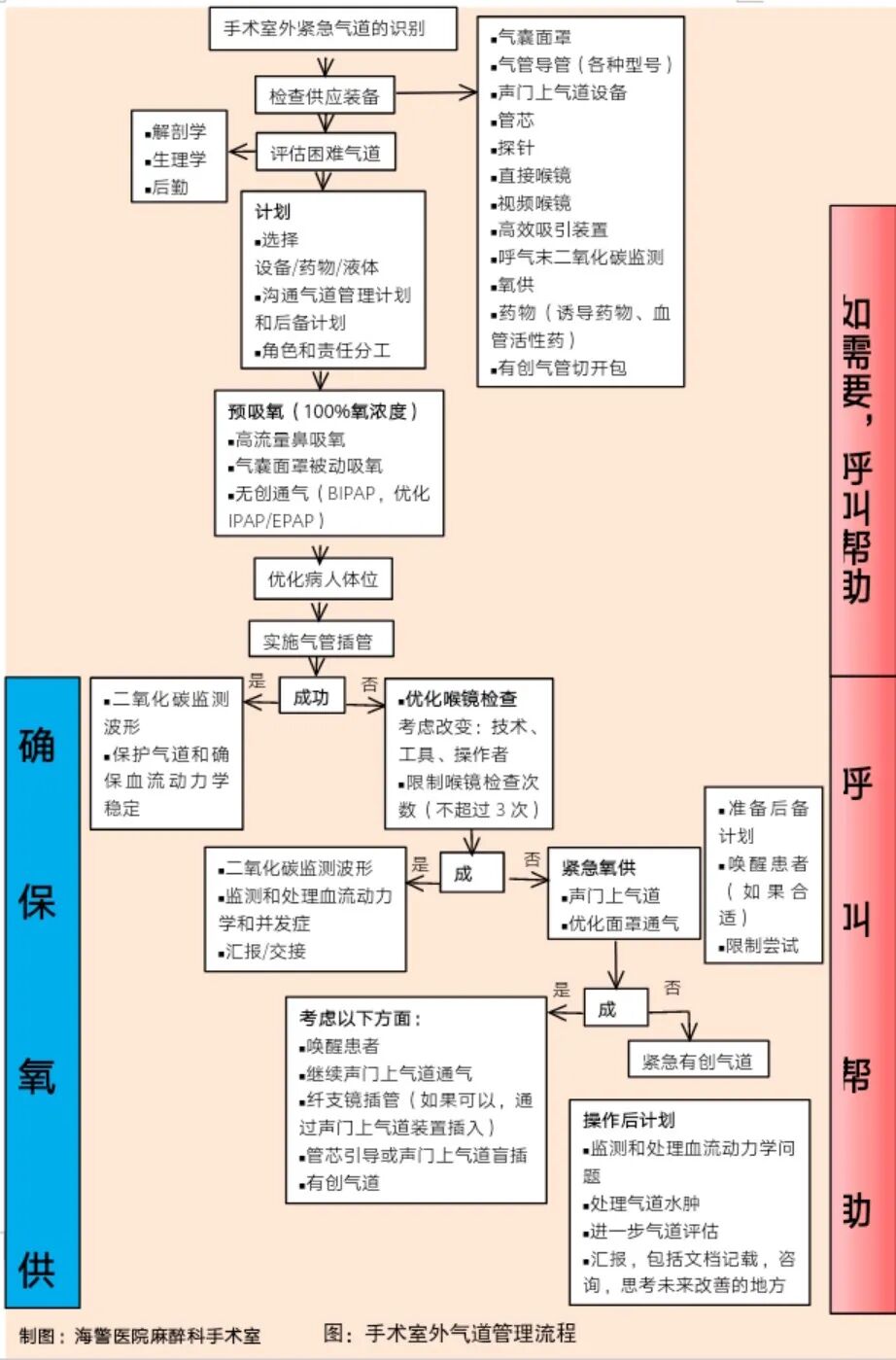 如果不讨论当事情不按计划进行时该怎么办,关于气道管理的讨论就不完整。有几个众所周知的辅助工具是为在手术室遇到困难的气道而开发的;但是,在手术室以外的情况下,资源有限。图中提出了一个全面的手术室外紧急气道管理的流程,包括在最初尝试气管插管不成功时的计划。病人的急性失代偿以及不利的环境和后勤因素使这种情况对最有经验的提供者也具有明显的挑战性。重要的是,参与手术室外紧急气道管理者要为挑战做好准备,练习好流程步骤,并接受培训,以便在这些紧张的情况下进行领导。保持冷静、呼救和在不同的备用计划之间快速转换是成功的关键。