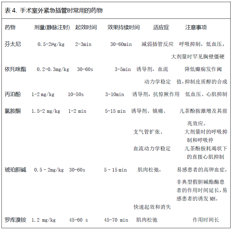 有关诱导药物、神经肌肉阻断剂(NMB)和血管抑制剂等药物在手术室外气道管理中的最佳使用和适应症的信息不断发展。围绕便于插管的最佳药物使用和选择的决策必须是个性化的,并仔细考虑每个病人的情况和合并症情况。表4列出了气道管理中常用的药物。