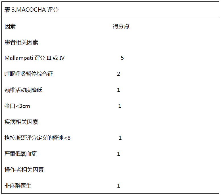 虽然认识到解剖学上的困难气道(获得声门视野或通过气管导管具有挑战性)是插管前评估的一部分,但在气道管理前对生理挑战的预测同样重要。MACOCHA评分(Mallampati评分III或IV,睡眠呼吸暂停综合征,颈椎活动度降低,张口<3cm,格拉斯哥评分定义的昏迷<8,严重低氧血症,如果从业者不是麻醉医生),结合解剖学、生理学和操作者的特点,明确强调插管医生不是麻醉医生时病人风险增加。该评分与手术室外环境非常相关,最近在一项多中心研究中得到验证(表3)。尽管在不合作的病人中可能无法评估所有的组成部分(例如,MP评分),但在适合的病人中应考虑使用MACOCHA评分进行风险评估。