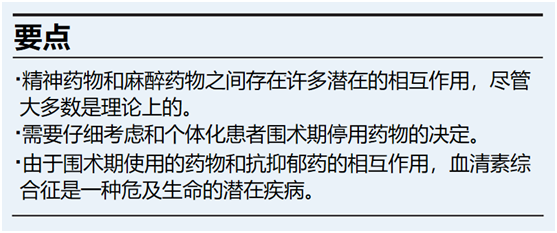 精神药物和麻醉药物之间可能会发生诸多药物相互作用。这些主要基于其已知的药理学推断至临床效果,而不是基于大型试验的结果。因此,建议采取谨慎、实效的方法。