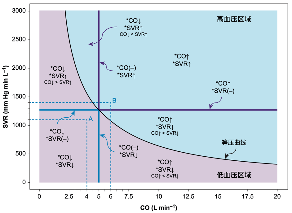 Fig.3.等压曲线将坐标界面分为低血压区和高血压区。横坐标表示CO,纵坐标表示SVR。以下方程阐明了不同全身血液动力学变量之间的关系:CO x SVR=(MAP -CVP)x 80。黑色曲线是等压曲线;对于给定的一对 CO 和 SVR 值,只要 CO-SVR 乘积等于 MAP 和 CVP 的差乘以 80,则由 CO-SVR 对确定的点落在等压曲线上。在这种情况下,我们假设 MAP 是 85 mm Hg,CVP 是 5 mm Hg 来举例说明这个概念;代表 CO 为 5 L /min 和 SVR 为 1280 mm Hg min /L 的点落在黑色等压曲线上,因为 CO-SVR 乘积等于 MAP-CVP 差乘以 80。左下方的紫色区域称为因为该区域中的任何点,无论其 CO 和 SVR 值如何,都会导致 MAP-CVP 差异比决定等压曲线的 MAP-CVP 差异更小。例如,由 4 L /min 的 CO 和 1100 mm Hg min /L 的 SVR 确定的 A 点对应于大约 55 mm Hg 的 MAP-CVP 差值;如果假设 CVP 等于 5 mmHg,则本例中的 MAP 为 60 mmHg。不同 CO 和 SVR 变化的组合代表了不同的低血压潜在病理生理。右上方的蓝色区域称为高血压区,因为该区域中的任何点,无论它代表什么 CO 和 SVR 值,都会产生比等压曲线上的 MAP-CVP 差值更大的 MAP-CVP 差值。例如,由 6 L /min 的 CO 和 1400 mm Hg min / L 的 SVR 确定的 B 点对应于大约 105 mm Hg 的 MAP-CVP 差值;如果假设 CVP 等于 5 mmHg,则本例中的 MAP 为 110 mmHg。不同 CO 和 SVR 变化的组合代表了不同的高血压的潜在病理生理。CO,心输出量;SVR,全身血管阻力;CVP,中心静脉压。